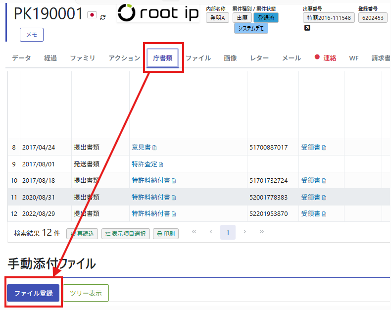 書類一覧は、電子出願ソフトサポートサイトで公開されているひな型を参考にしております。https://www.pcinfo.jpo.go.jp/site/2_download/3_hina/以下書類の取込はroot ipでは取込が出来ませんので、案件の「庁書類」タブまたはファイルタブ等、運用に合わせてファイルを手動登録してください。