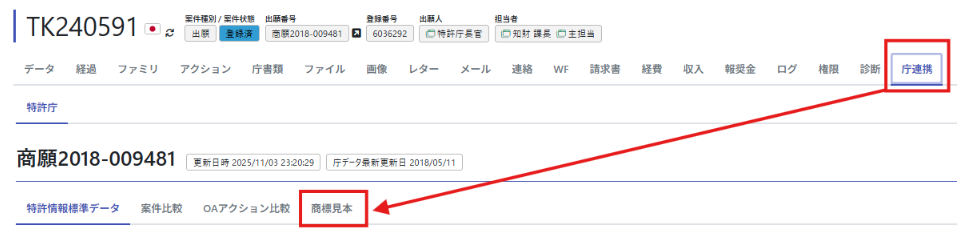 ②案件のメニューバー右端の「庁連携」をクリックし、「商標見本」をさらにクリックします。
