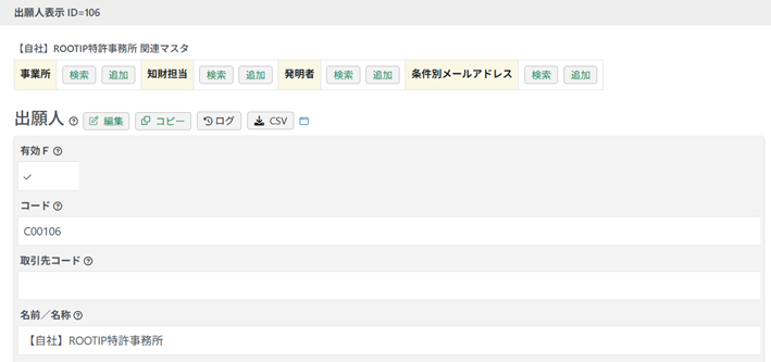 「自社出願人マスタ」とは、自社(特許事務所など)自身を出願人として登録したマスタです。