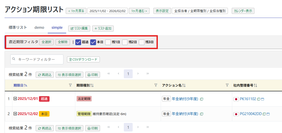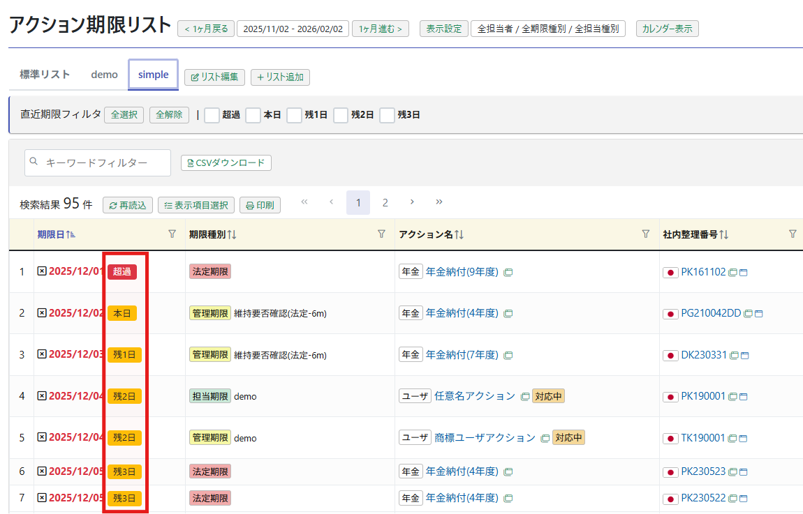 トップページのアクション期限リストで、直近期限(超過、本日、残1-3日)がアラート表示されるようになりました。