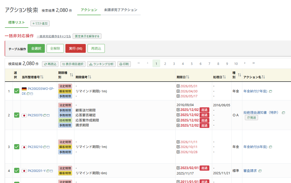 500件を超えると全選択で一回に選択される対象が100件に制限されます。期限日等で適宜絞り込みください。