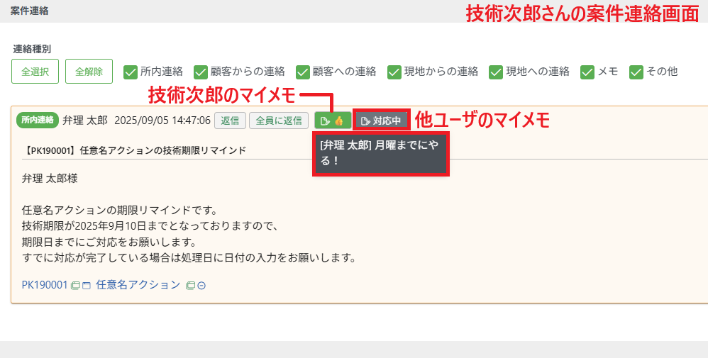案件/アクション/請求書/仮明細/連絡/WFに自分専用のメモを登録できるようになりました。
