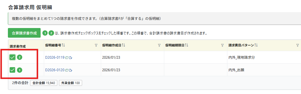 「請求書作成」チェックボックスにチェックを入れた仮明細の順番が、そのまま請求書上の費目順として反映されます。