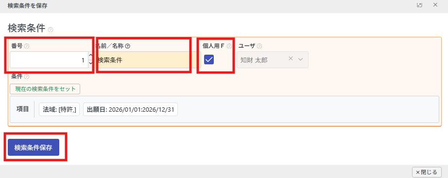 表示されたダイアログで、必要な項目を設定します。「検索条件保存」をクリックすると保存が完了します。