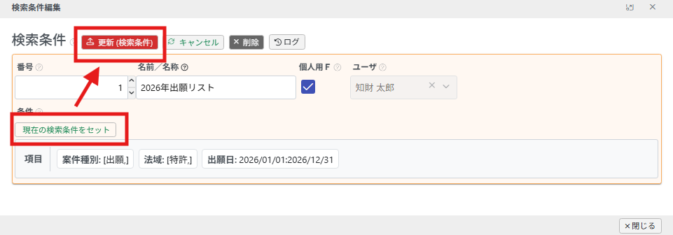 「現在の検索条件をセット」ボタンをクリックし検索条件を反映します。