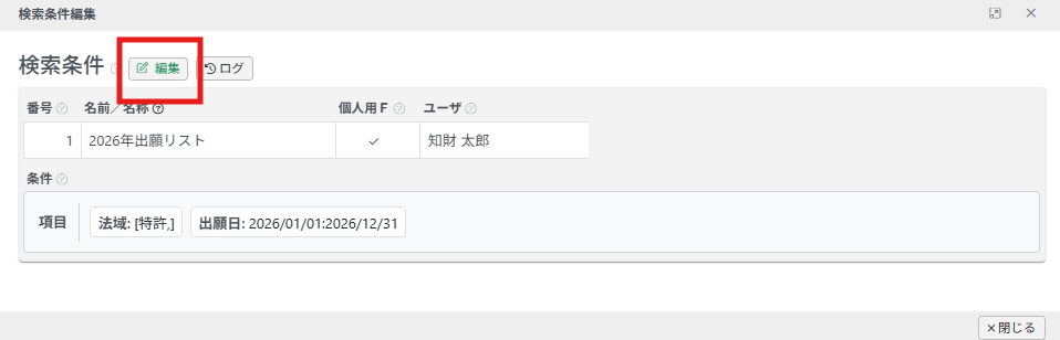次に編集したい検索条件にカーソルをあて「保存ずみ検索条件を編集」ボタンをクリックします。