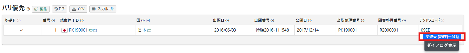- パリ優先テーブルのアクセスコードは、基礎案件をセットすると自動的に引き継がれます。