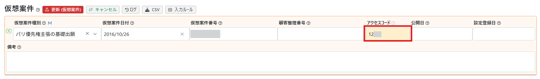 パリ優先テーブルと仮想案件テーブルに「アクセスコード」欄を追加しました
