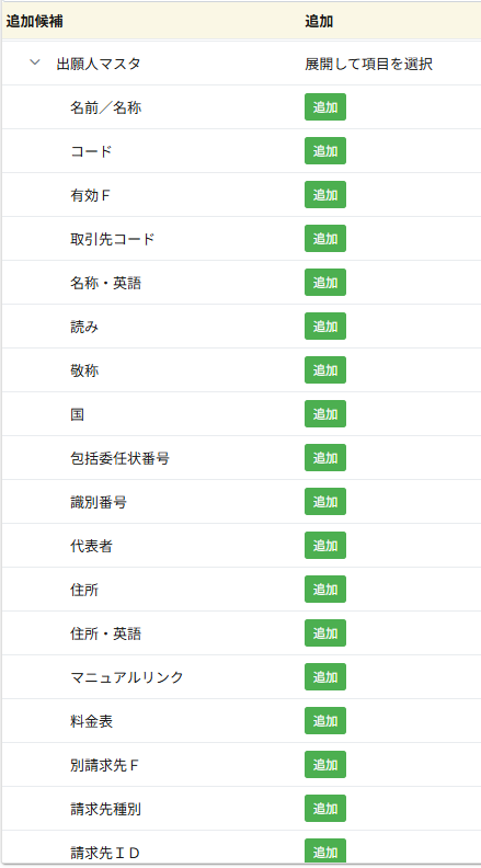 2026-02-24 / 最終更新日 : 2026-02-24 user 更新情報 リストに各種マスタデータの追加が可能になりました リストの表示項目追加候補に、各種マスタデータの追加が可能になりました。 マスタに登録されているすべての項目が追加候補となります。(下図例:出願人マスタ)