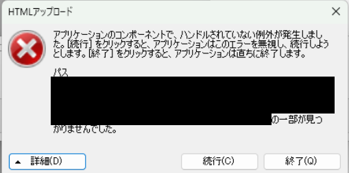 エラー内容:アプリケーションのコンポーネントで、ハンドルされていない例外が発生しました。[続行]をクリックすると、アプリケーションはこのエラーを無視し、続行しようとします。[終了]をクリックすると、アプリケーション」は直ちに終了します。