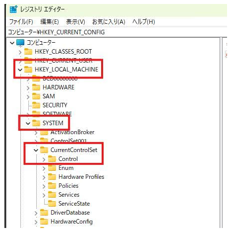 ②-2 以下の順に進みます。 HKEY_LOCAL_MACHINE > SYSTEM > CurrentControlSet > Control