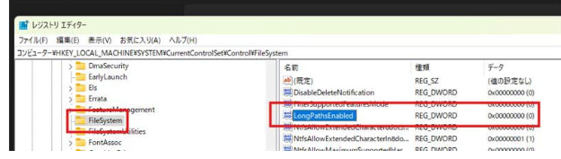 ②-3「FileSystem」内の「LongPathsEnabled」をダブルクリックしてください。