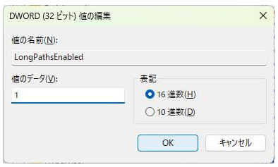 「LongPathsEnabled」を「1(有効)」に設定することで、この260文字制限を解除できます。