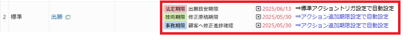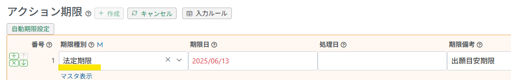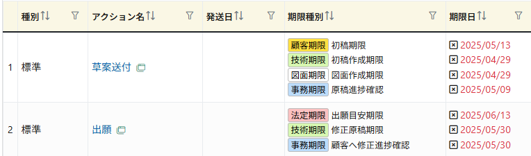 案件を作成すると、出願までに管理が必要な草案送付期限や出願期限を「アクション」として登録することが出来ます。所内期限はいくつでも登録することが可能です。