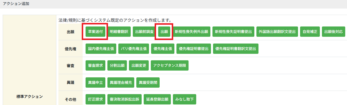 草案送付・出願アクションは標準アクショントリガにカテゴライズされております。アクション>アクション追加>標準アクションから追加してください。