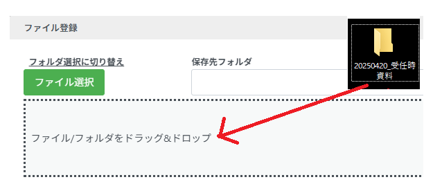 ②案件メニューバー>ファイル>ファイル登録ボタンをクリックし、フォルダごとグレーのゾーンにドラッグアンドドロップします。