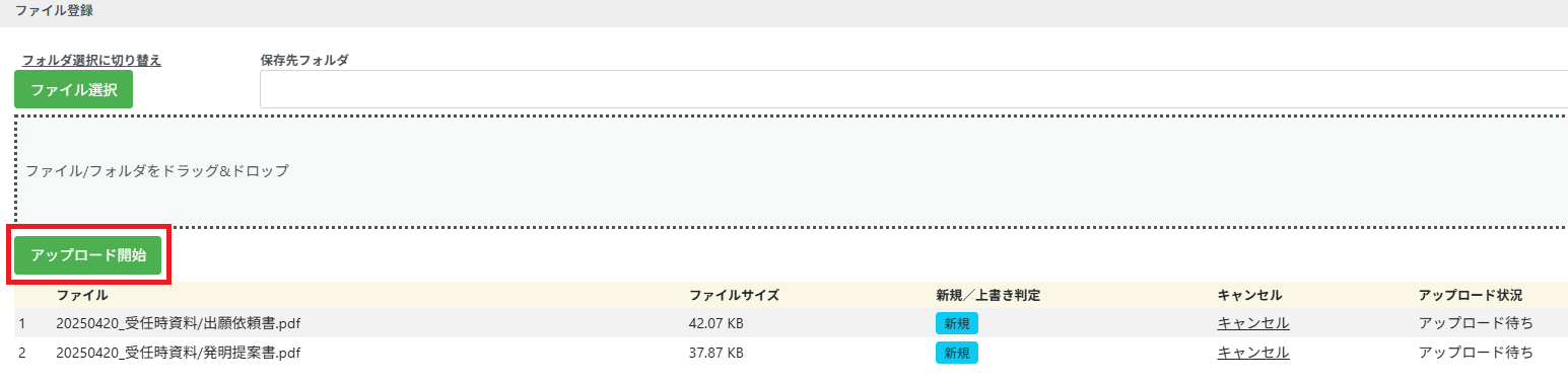 ③フォルダに格納したファイル類がまとめてアップロードされますので、「アップロード開始」を押します。