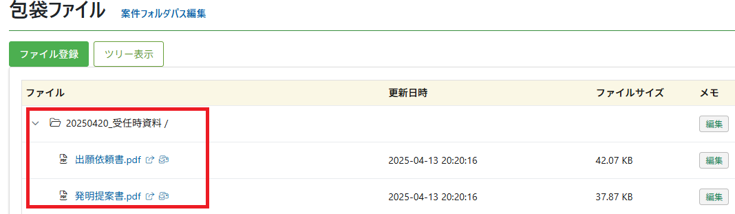 出願人から受領した発明提案書・出願依頼書等の電子ファイルは、案件の「ファイル」タブに登録することが可能です。