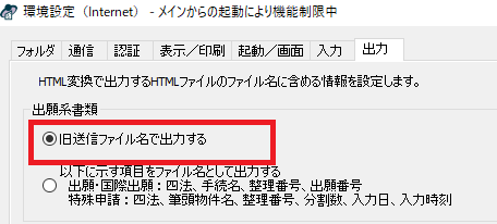 ▼インターネット出願ソフトの環境設定(ツール>環境設定>出力)をタブの「出願系書類」のせっていを「旧送信ファイル名で出力する」に設定をお願いします。