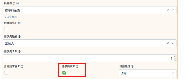 出願人マスタの作成時に、契約者名※の表記に基づき、源泉徴収Fの初期状態が以下のように自動設定されます。