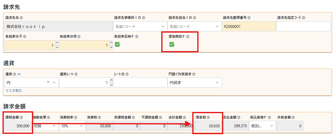 root ipクラウドでは、請求書作成時の課税金額に応じて、自動的に該当パターンを判定し、源泉徴収額を計算します。
