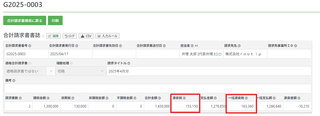 一括源泉税 | 個別請求書の課税金額合計に対して再計算された、全体に対する源泉徴収税額です。 | 合計請求書が適格請求書である場合に使用されます。 |