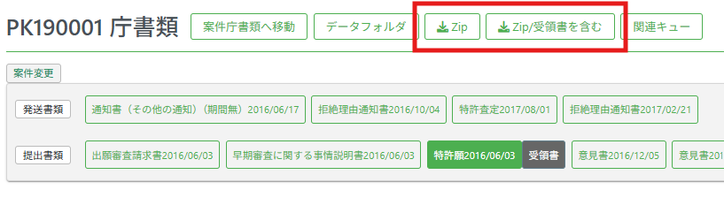 庁書類一式のファイル共有リンクを生成したい場合は、庁書類画面の「Zip」または「Zip/受領書を含む」ボタンをクリックしZipファイルをダウンロードし、そのZipファイルを案件の「ファイル」タブに登録したうえで、共有リンクを生成します。