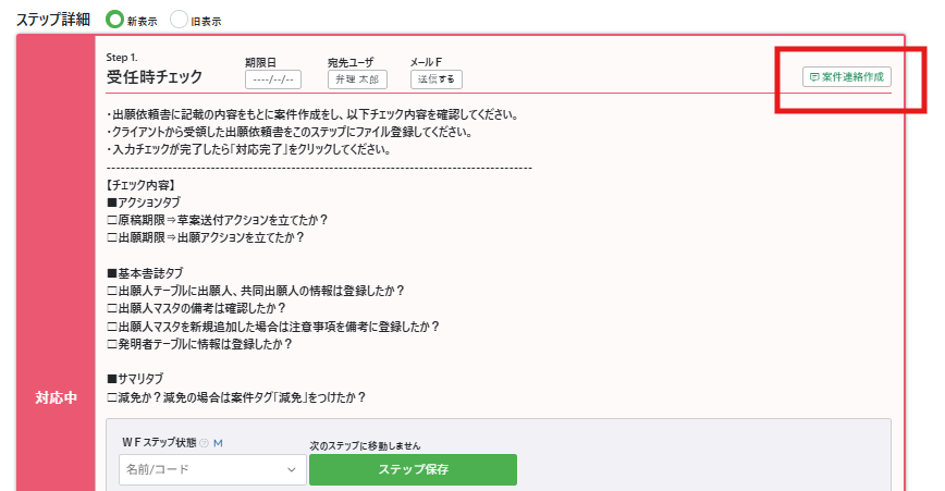 ワークフローステップ右上の[案件連絡作成]をクリックすると、該当ステップに紐づいた案件連絡を作成画面が開きます。