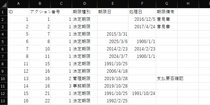 そのため、アクション期限CSVには、すでに削除されている案件や期限のデータが含まれる場合があります。