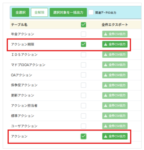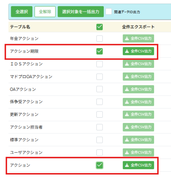 また、削除済みのアクション期限や、削除済み案件に登録されていたアクションも出力されます。